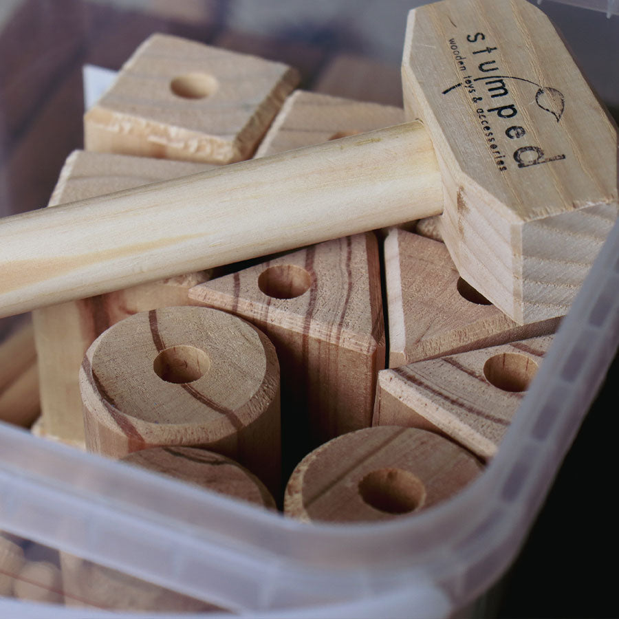 8x Dinky Blocks, 6x Dinky Rolls, 6x Dinky Tris, 40x Wooden Dowels, 1x Stumped Wooden Hammer.