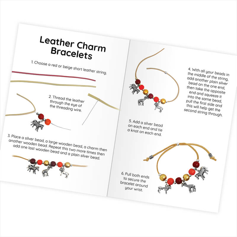A beautifully packaged assortment of wooden beads, Africa themed charms, leather and elastic string, metal book mark and a booklet of step by step ideas. Ideal for ages 5+